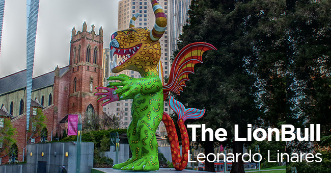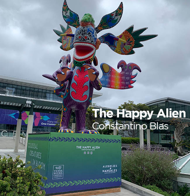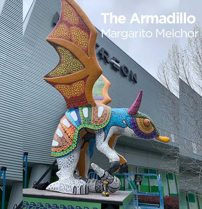 Philip Van Cauteren, the director of the Ghent Museum once said: “Contemporary artists have to fight for space in an increasingly noisy environment, where they compete with omnipresent media and advertising images, and the impact of vast cities and skyscrapers.” To get a hearing in a society overwhelmed by information and visual stimuli, artists seek to produce images that create a strong impression. The huge scale takes the fanciful alebrijes to an even more magical level. The ultimate goal of those spectacular pieces is to give the public pause for thought and to experience an installation that creates a strong and immediate effect, bringing energy and life to communities and individuals who have felt their lives constrained by the virus. The bright colored animal figures speak to people of all ages. The 20 feet high sculptures are reproductions of original carved wooden works by recognized local artists from various communities.